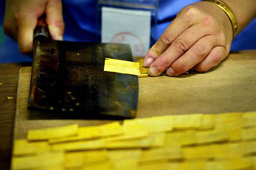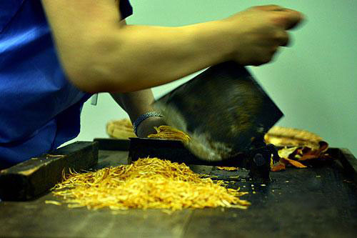 樟树饮片继承了传统工艺,选料上乘,切制精良。有“白芍飞上天,术通不见边陈一条线,半夏鱼鳞片,肉桂薄肚片,黄柏骨牌片,甘草柳叶片,黄芪瓜子片,枳壳凤眼皮-片,川芎蝴蝶双飞片,槟榔切108片,一粒马钱子切206片(腰子片)”的说法。其刀工独具一格,片型美观,厚薄适中,反映了樟树药帮的制作工艺特色。
